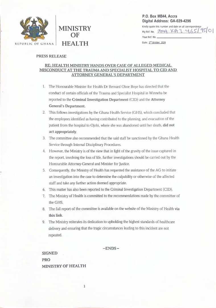 The GHS investigation, prompted by the patient’s abandonment after being transferred to Ojobi, concluded that the hospital staff involved did not take appropriate action, resulting in the tragic outcome. In a statement issued on Wednesday, 2nd October, the Ministry of Health disclosed that these findings point to serious misconduct that requires further investigation.