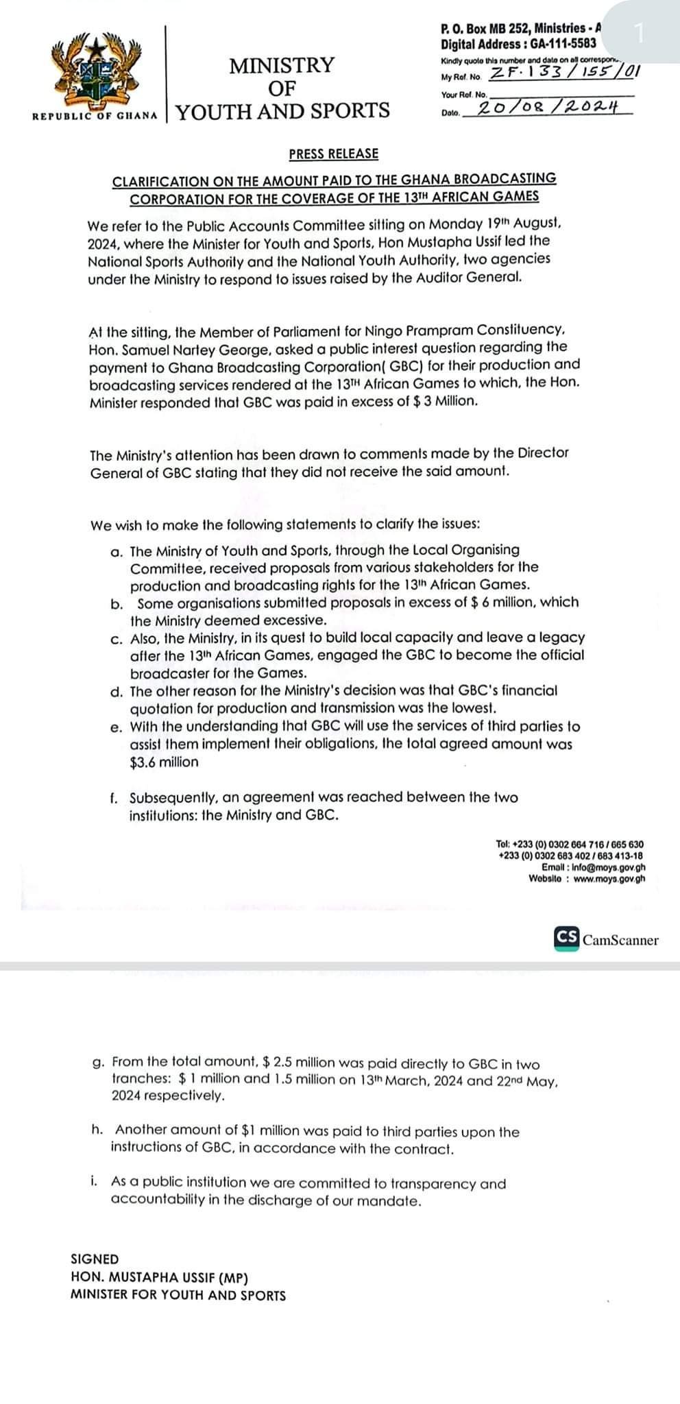 “The Ministry, in its quest to build local capacity and leave a legacy after the 13th African Games, engaged the GBC to become the official broadcaster for the Games. The other reason for the Ministry’s decision was that GBC’s financial quotation for production and transmission was the lowest,” the Sports Minister said in a press release.