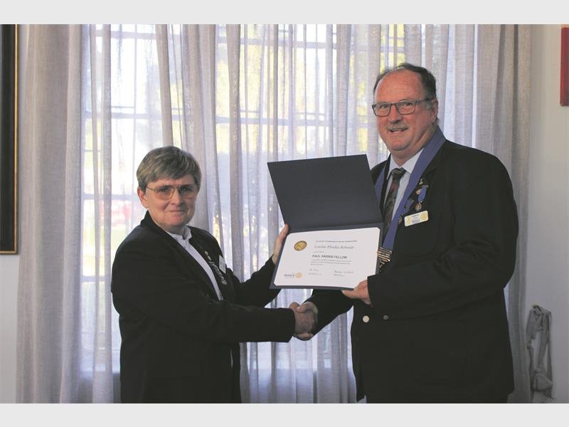 Lauren Froneman is awarded the Paul Harris Fellow by incoming president Andrew Irvine. Photo: Zamokuhle Ndawonde
