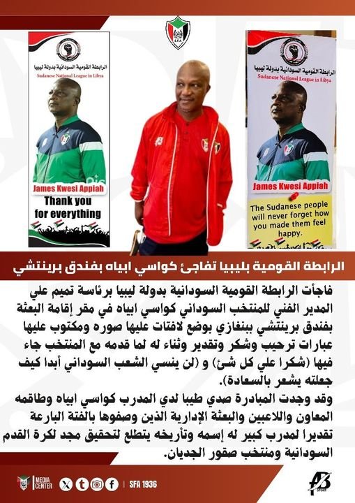 “The National Association of Libya surprised Kwesi Appiah at the Brenchy Hotel. The Sudanese National Association in Libya, headed by Tamim Ali, the technical manager of the Sudanese national team, surprised the delegation at the Brenchy Hotel in Benghazi by placing banners with his picture on them.